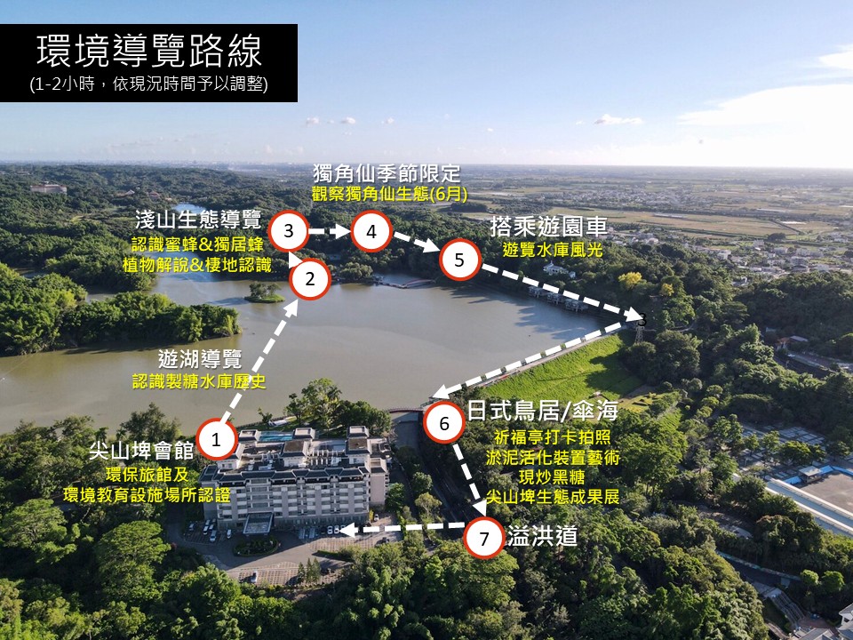 二、柳營尖山埤渡假村位於臺南市柳營區,距國道三號柳營交 流道出口約5分鐘車程。園區已取得環境教育設施場所認 證,